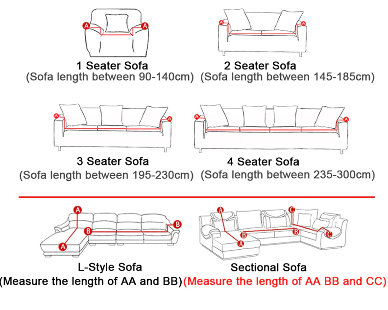 1-seater sofa cover: length of the sofa should be within 90 to 140cm/ 35 to 55 Inch. 2-seater/ loveseat cover: length of the sofa should be within 145 to 185cm/ 57 to 72 Inch. 3-seater sofa cover: length of the sofa should be within 190 to 230cm/ 75 to 90 Inch. 4-seater sofa cover: length of the sofa should be within 235 to 300cm/ 92 to 118 Inch.