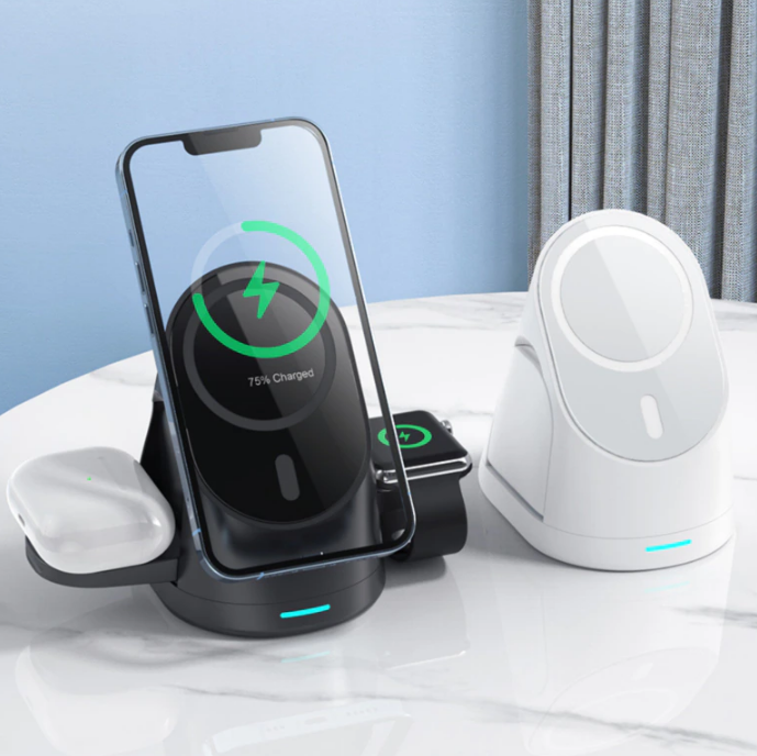 The 3in1 Space Station Magnetic Wireless Charger Stand is a versatile device charging solution. This sleek and compact stand features three separate charging pads, allowing you to charge multiple devices simultaneously. The stand is made from high-quality materials and has a sleek and modern design, making it a stylish addition to any desk or nightstand. Overall, the 3in1 Space Station Magnetic Wireless Charger Stand is the perfect way to charge multiple devices simultaneously without the hassle of tangled cables.