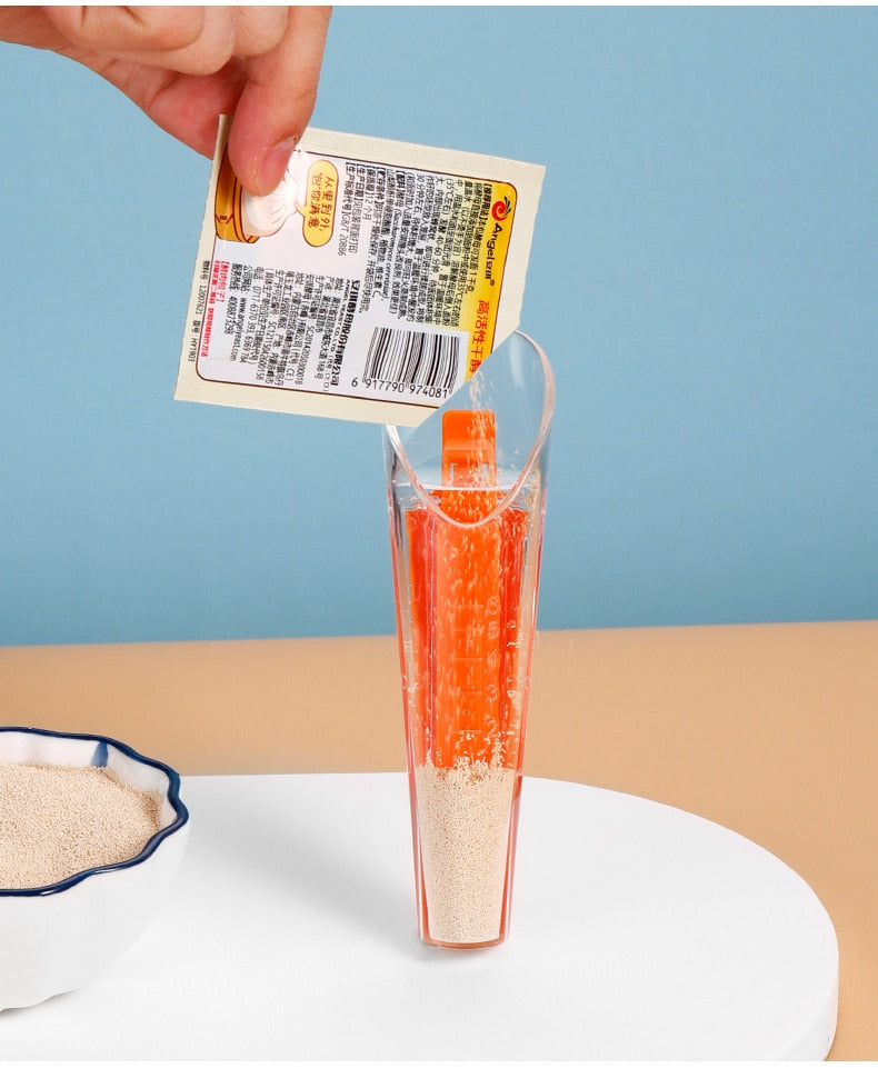Creative kitchen adjustable measuring Cups. Adjust according to the capacity you need, with scale. The capacity of the measuring cup can be clearly seen. The back can be used as a clip to keep the unused yeast package tightly sealed