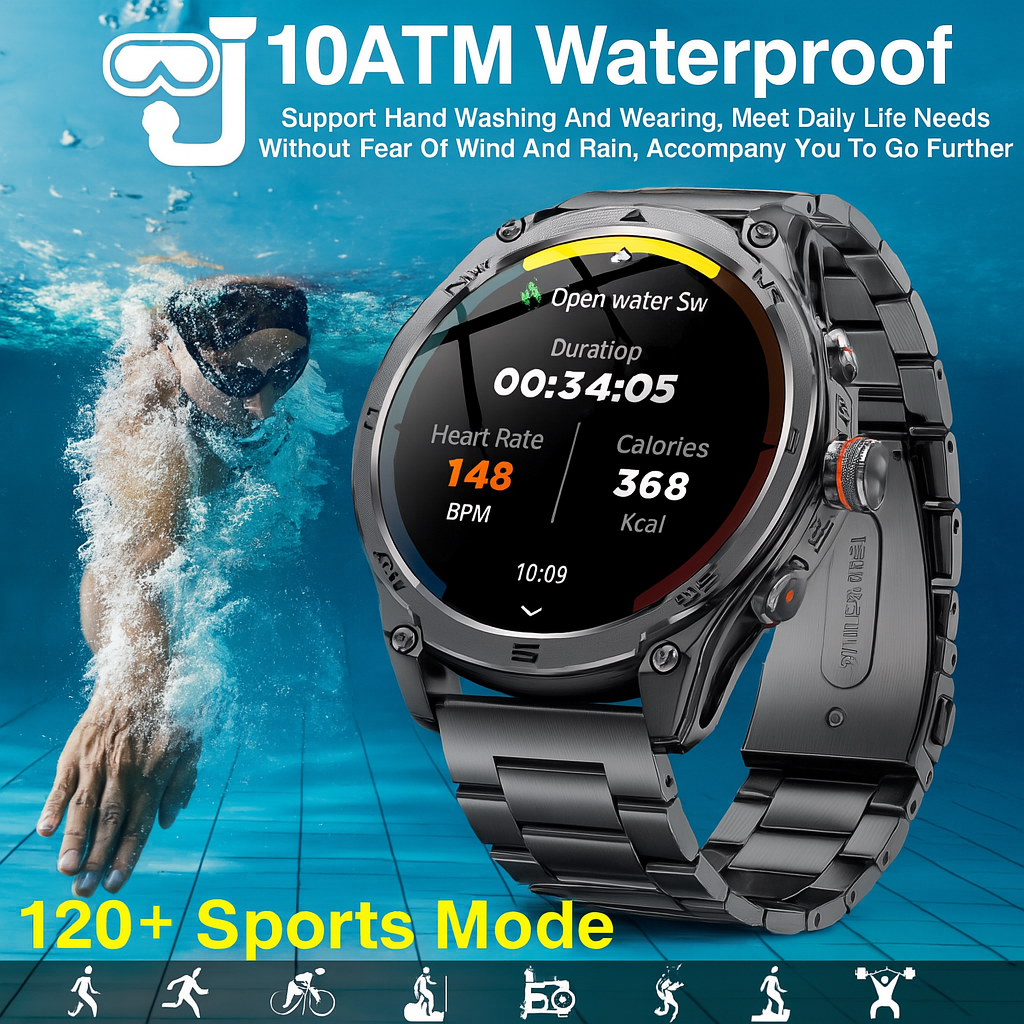 Equipped with high-precision multi-satellite GPS positioning and over 120 sport modes, this smartwatch tracks your every move—from steps to altitude—with unmatched accuracy. Its professional waterproof rating allows swimming at depths up to 50 meters, making it perfect for all aquatic activities.