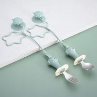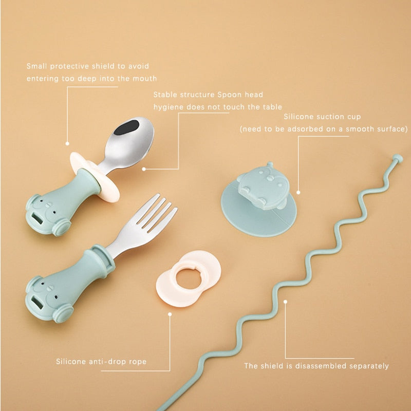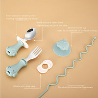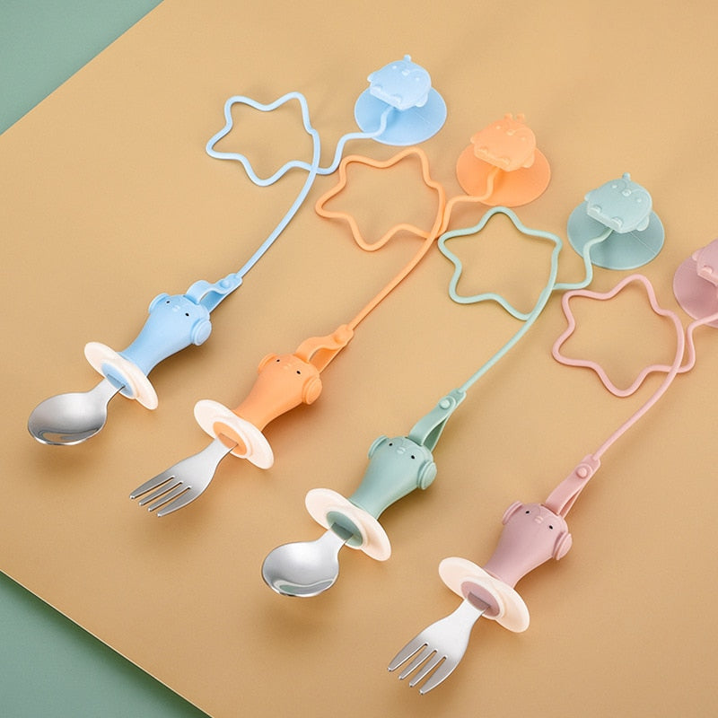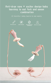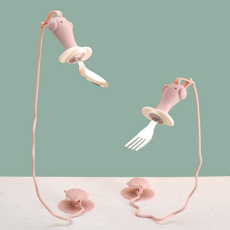 The Anti-drop Baby Spoon Fork Set is a set of baby utensils. This set includes a spoon, fork and knife for your little one. The spoon and fork are attached by a ring to avoid them getting lost or dropped on the floor when you're out and about with your child.