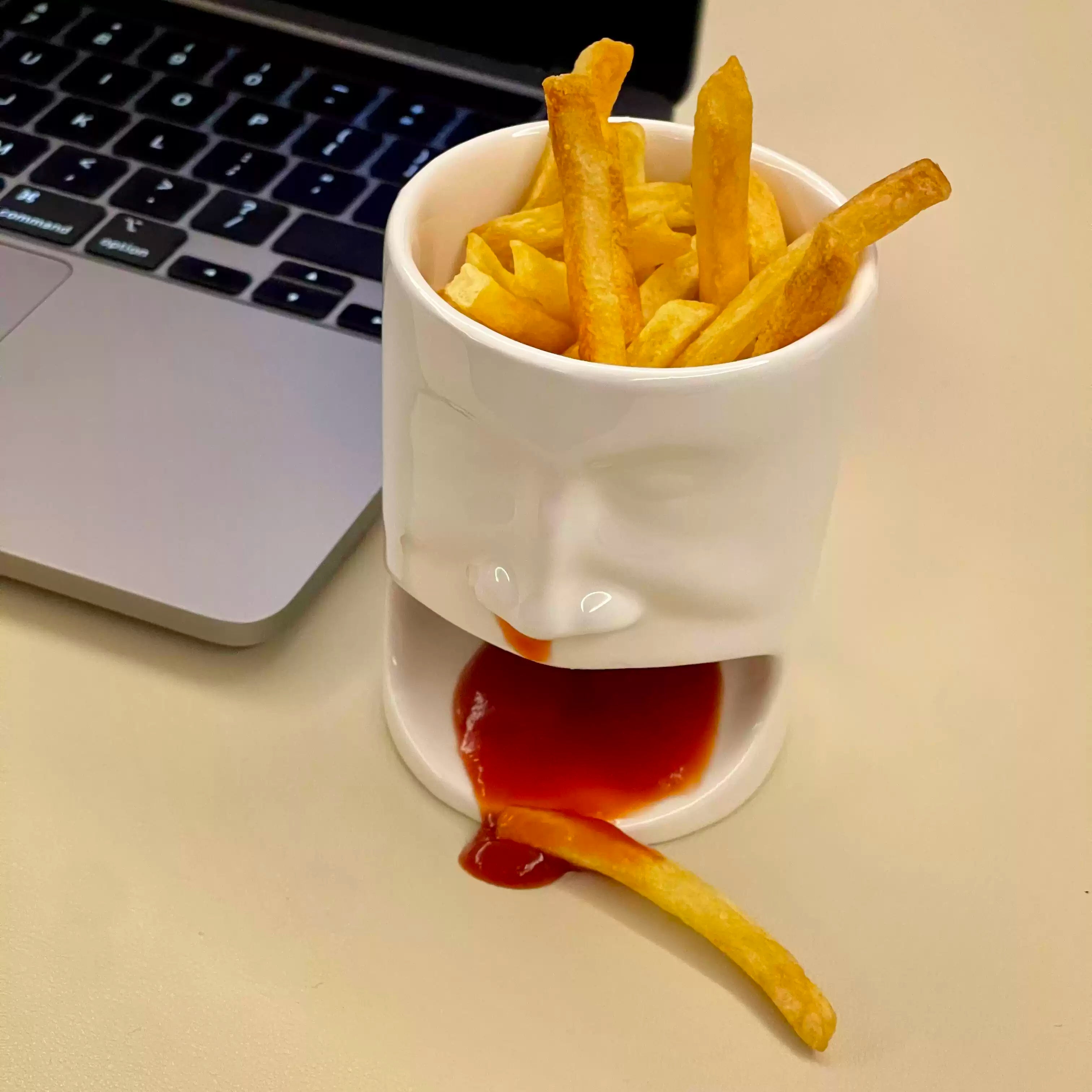 Add a playful twist to your mealtime routine with this uniquely designed face-shaped mug. More than just a coffee cup, its wide "mouth" opening doubles as a convenient holder for biscuits, donuts, fries, or even a sauce dip. Whether you're pairing your drink with a snack or using it as a quirky serving accessory, it’s sure to be a conversation starter.