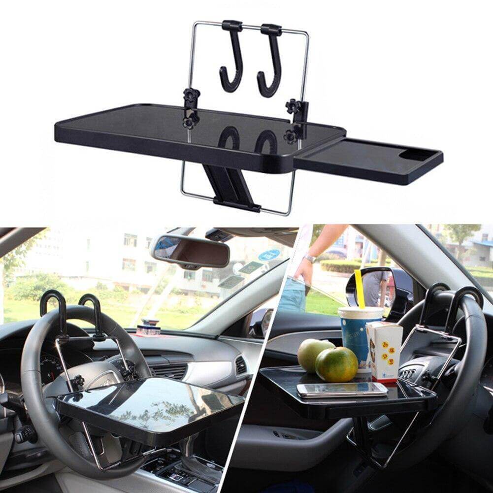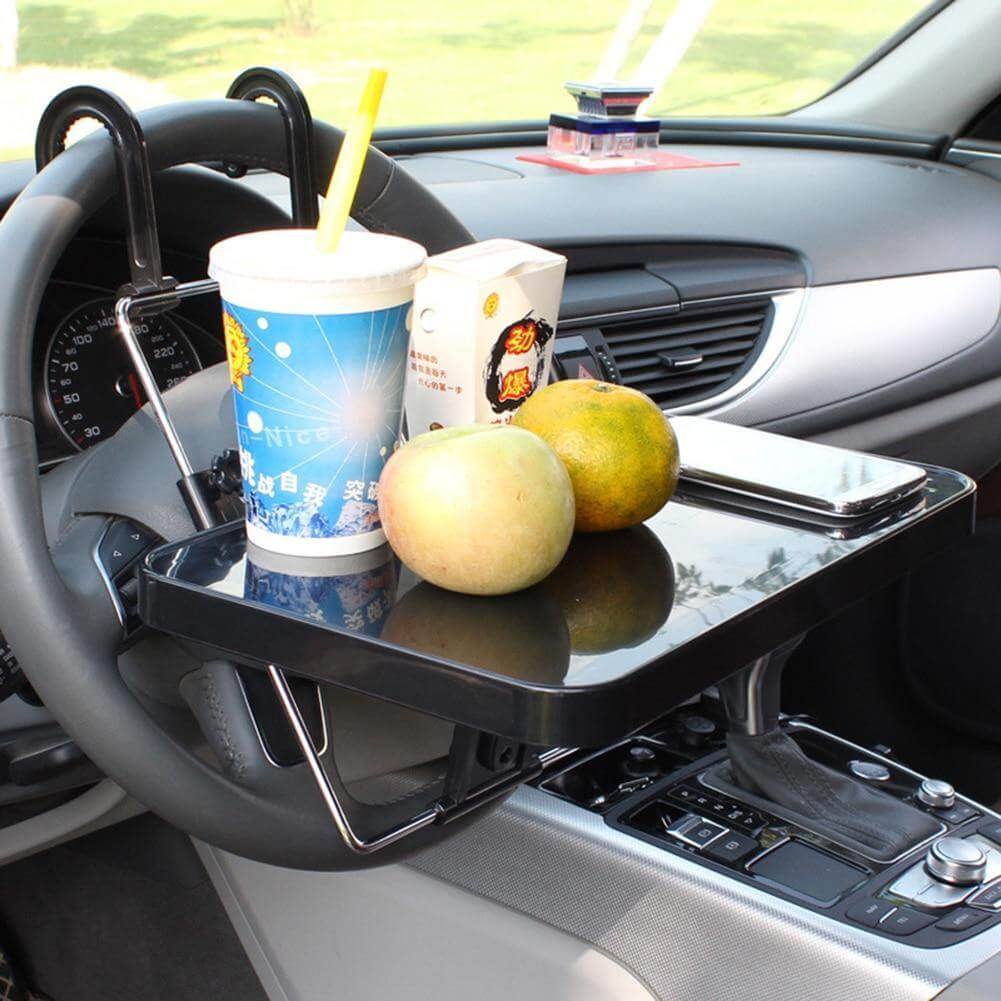 No more spills while driving! This Car Steering Food Holder Tray fits perfectly in the car's cup holder and holds your drinks and snacks in place. This food holder tray sits in your car and holds your phone, keys, laptop, change, or other items you may need to keep handy while on the road.