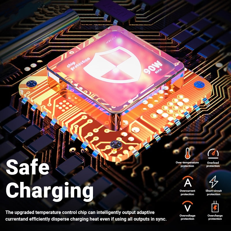 Safe Charging: The upgraded temperature control chip can intelligently output adaptive currentand efficiently disperse charging heat even if using all outputs in sync.