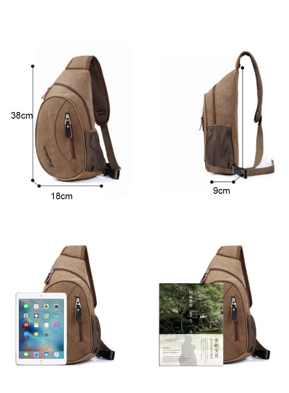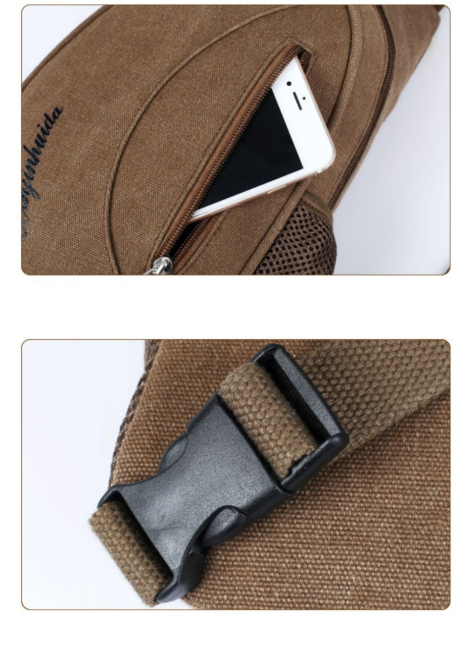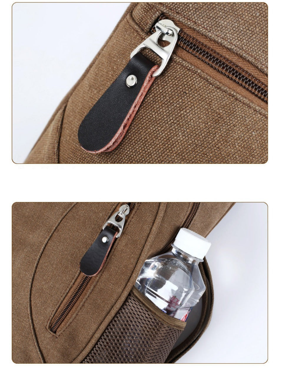 A crossbody bagpack with flap closure, adjustable shoulder strap, and zipper pocket at the front. The main compartment is equipped with a zipper pocket.