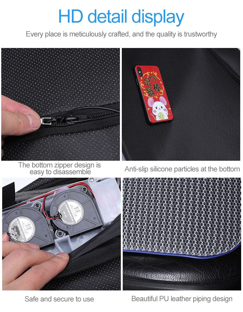 The wind of the ventilated seat cushion can be adjusted on three levels. You can adjust it according to the wind power you need.Innovative noise control technology is adopted to effectively reduce the noise generated during operation and improve comfort.