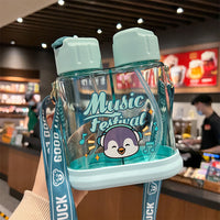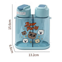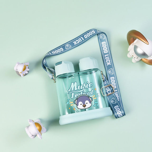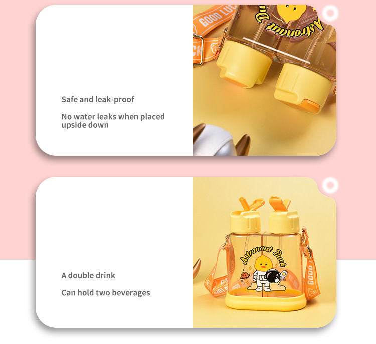This is a double-cup water bottle that allows you to drink from both cups simultaneously. It has two straws. With this sleek and stylish water bottle, you can take two drinks. It's a great way to stay hydrated while getting your caffeine fix or taking a break with some flavored water.