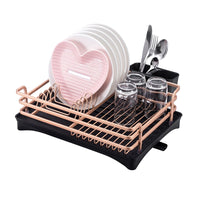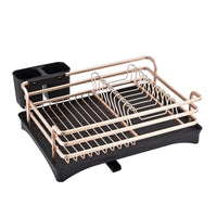 This dish drying rack is made of aluminum which never rusts and is lighter than stainless steel. It has four rubber feet to protect your sink and countertop from scratching against chips and scratches.