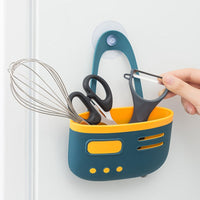 Kitchen double sink drain basket. Perforated bathroom faucet hanging basket. The bottom hollow design can ventilate and drain water to keep dry. Can be hung on the faucet or attached to the wall, easy to store and save space.