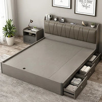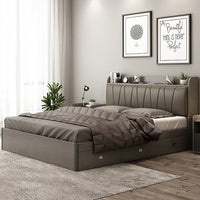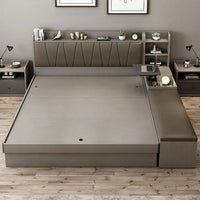 This lift-up platform bed offers a clever storage solution with spacious compartments underneath, perfect for organizing bedding, clothes, and other essentials. The design combines functionality and comfort with a padded headboard and integrated side shelves for added convenience. Crafted from durable materials, it provides both style and practicality for any bedroom.