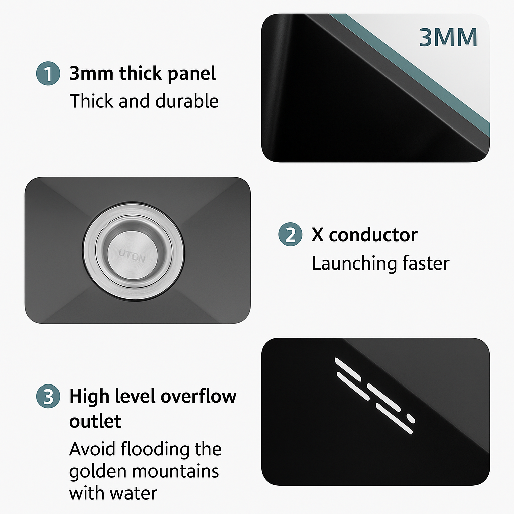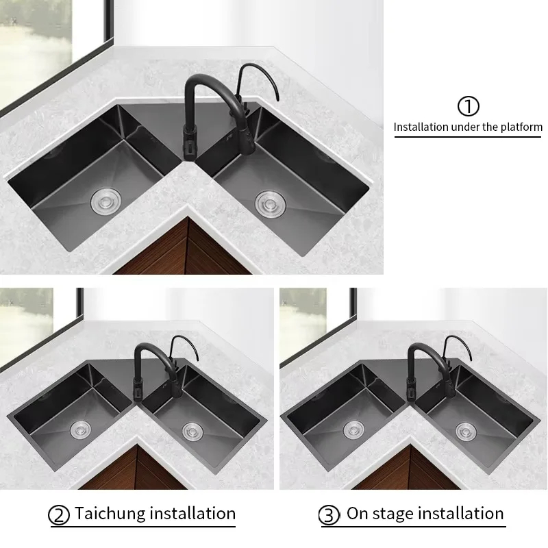 This stylish corner-mounted sink offers a smart solution for kitchens short on space. With two deep basins and a rotating faucet, it combines efficiency and elegance in one streamlined design.