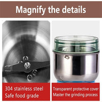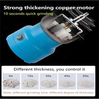 Efficient: High-power motor, four-blade serrated blade, rotary cutting, precise structure, low noise, can quickly crush all kinds of dehydrated food, rice, corn, sesame, soybean, fish feed, pepper, medicine, more uniform grinding.