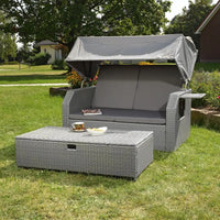 Transform your outdoor relaxation with the Foldable Sunshade Double Canopy Outdoor Lounge Sofa. Designed for ultimate comfort and durability, this multipurpose outdoor lounge seat features a spacious double sun bed, adjustable canopy for all-day shade, and plush cushioning. The elegant modern design fits seamlessly into courtyards, poolside areas, hotels, or any outdoor oasis. Crafted from robust rattan/wicker with a sturdy iron frame and solid wood elements, this sofa effortlessly accommodates up to four people—perfect for family gatherings and luxurious lounging.