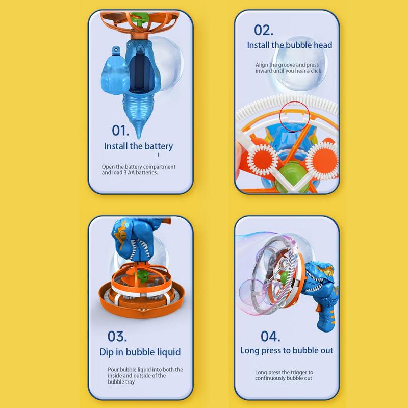 This dinosaur bubble machine is easy to install and use, pull the trigger and the bubble machine releases a whole bunch of bubbles.