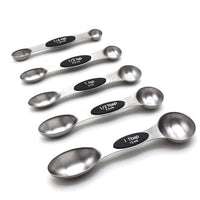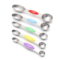 Set of 5 stainless steel magnetic spoons: 1/4 tsp, 1/2 tsp, 1 tsp, 1/2 Tbls, 1 Tbls.A flat base allows spoons to rest on the counter without spilling contents.The narrow end is designed to fit most spice jars and the round end is for liquids. Magnets allow spoons to nest while stored.Safe to use in the dishwasher
