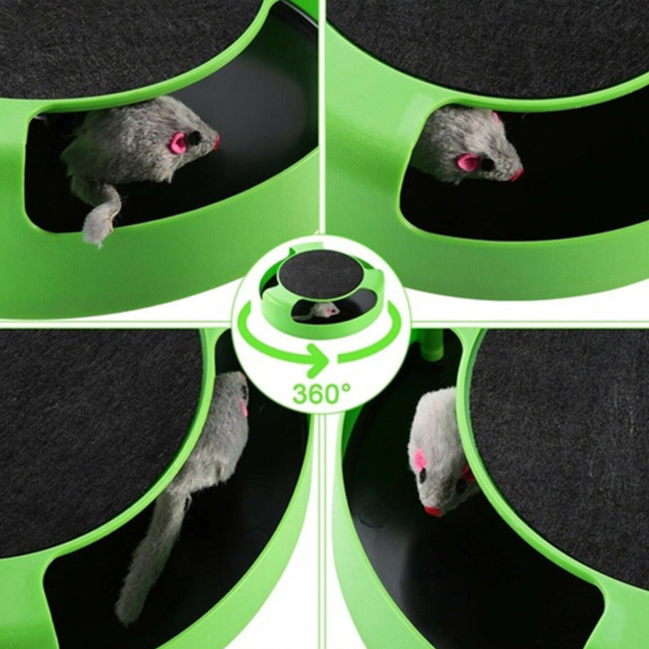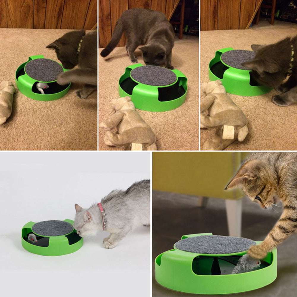 • It's a rotating mouse that spins around on top of a turntable, making it fun to chase after.
