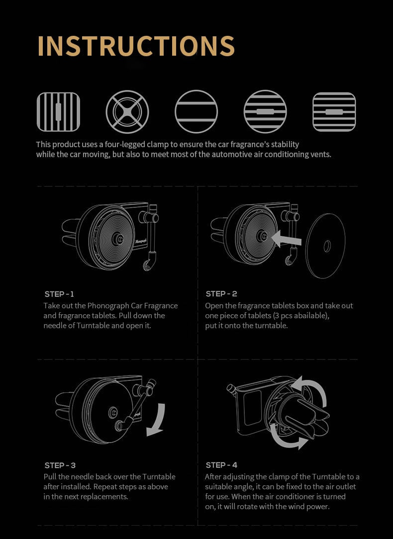 - Easy operation: you could put the car oil aromatherapy diffuser on the air conditioner vent firstly, then put the aromatherapy pad on the record player air freshener; Opening the car air conditioner, the car vent diffuser will work, and the aroma can rotate with the air conditioning wind to bring fragrance.