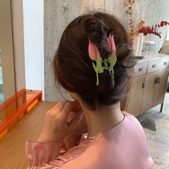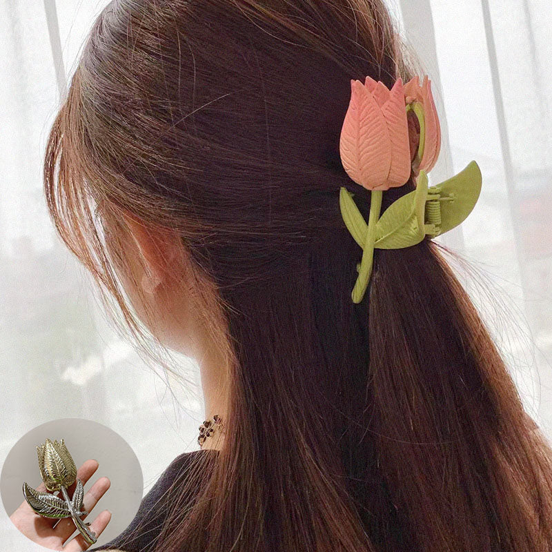 Ponytail Tulip Hair Claws is a claw hair clip. It clips hair securely in a ponytail or bun. The claw design allows you to hide hair underneath.