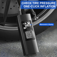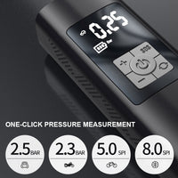 The wireless design and compact mini size make the air compressor easy to carry and can be operated with one hand. In just 4 steps, the compressor is ready. The LCD display shows the air pressure. It is suitable for inflating car tires when the tires are insufficient, and fully inflating bicycle and motorcycle tires