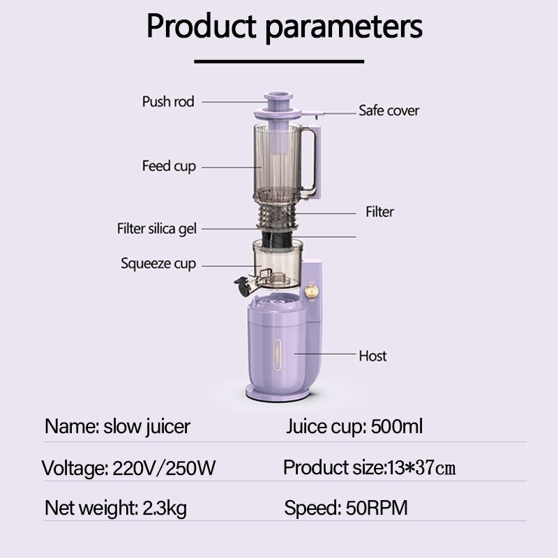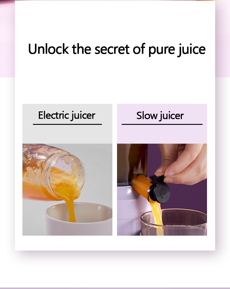 This juice machine has a compact body and a large-caliber inlet. The screw press and slow squeezing make the pure juice zero slag and will not easily lead to the oxidation of nutrients, allowing you to enjoy the silky-smooth taste of the juice.