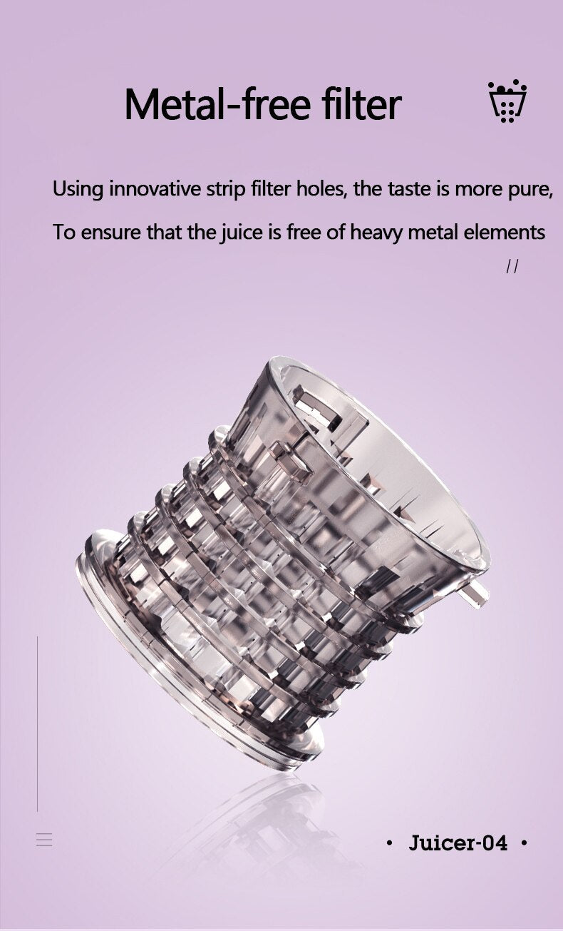 No metal filter: Abandon the traditional metal filter, use innovative strip filter holes; the taste is purer to ensure that the juice is free of heavy metal elements.