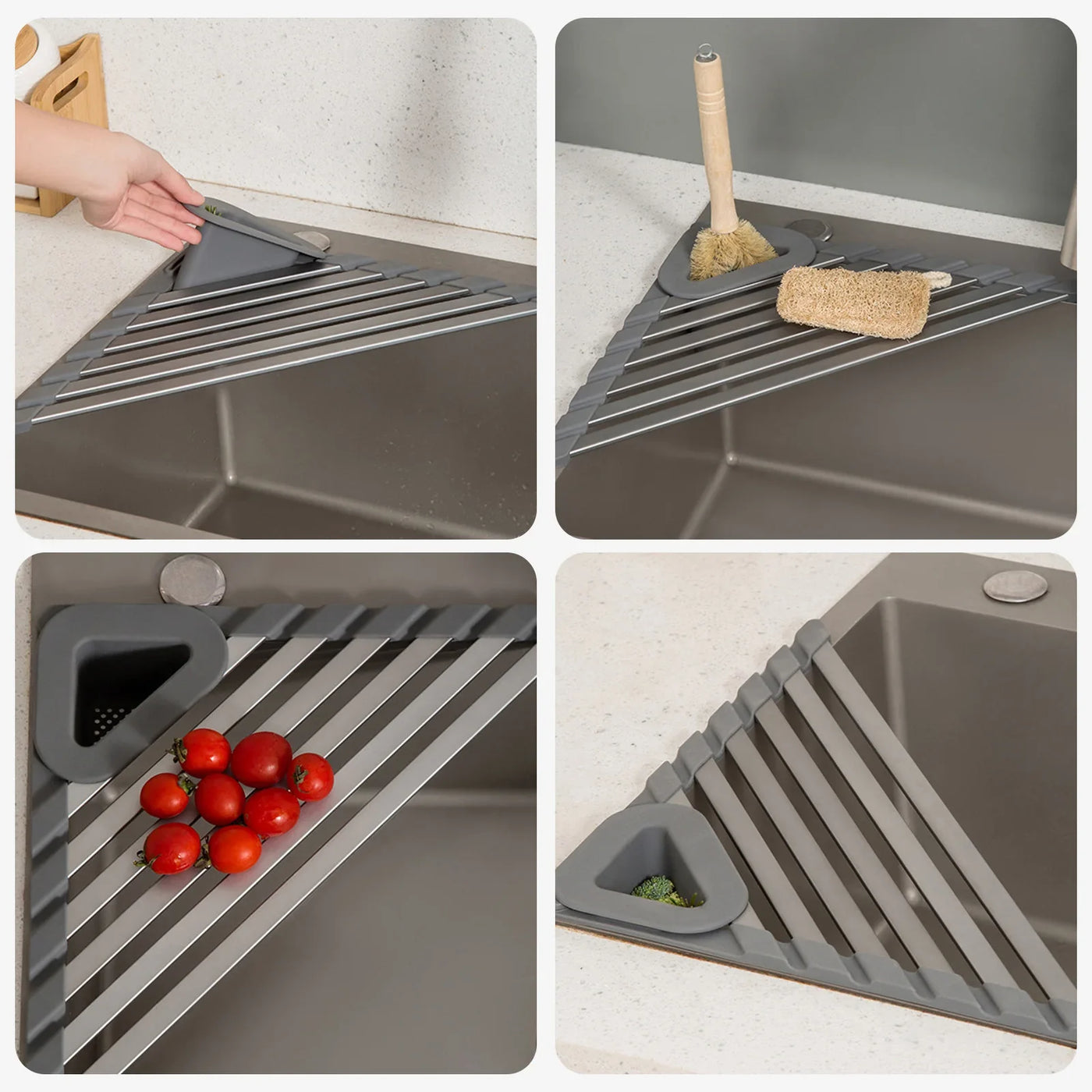 How does this product compare to others? Unlike traditional drain racks, the triangular design maximizes sink space while adding an aesthetic touch. Its combination of silicone and aluminum offers superior durability compared to all-plastic alternatives.