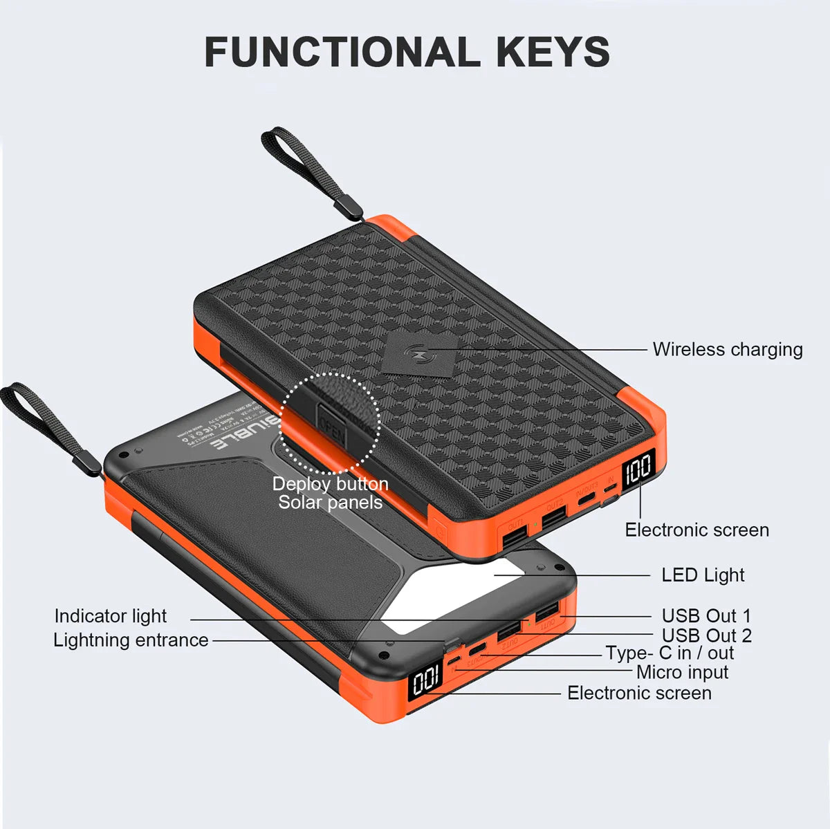 The Solar Fast Charging Ultra-Large Capacity Portable Powerbank is a reliable companion for your outdoor adventures, ensuring you never run out of power for your devices. With a massive 20000mAh battery capacity, this power bank can keep your devices charged multiple times on a single charge. The solar charging feature provides an eco-friendly way to replenish the power bank's energy under sunlight. Equipped with a portable lanyard and compass, this power bank is designed for convenience and functionality wherever you go.