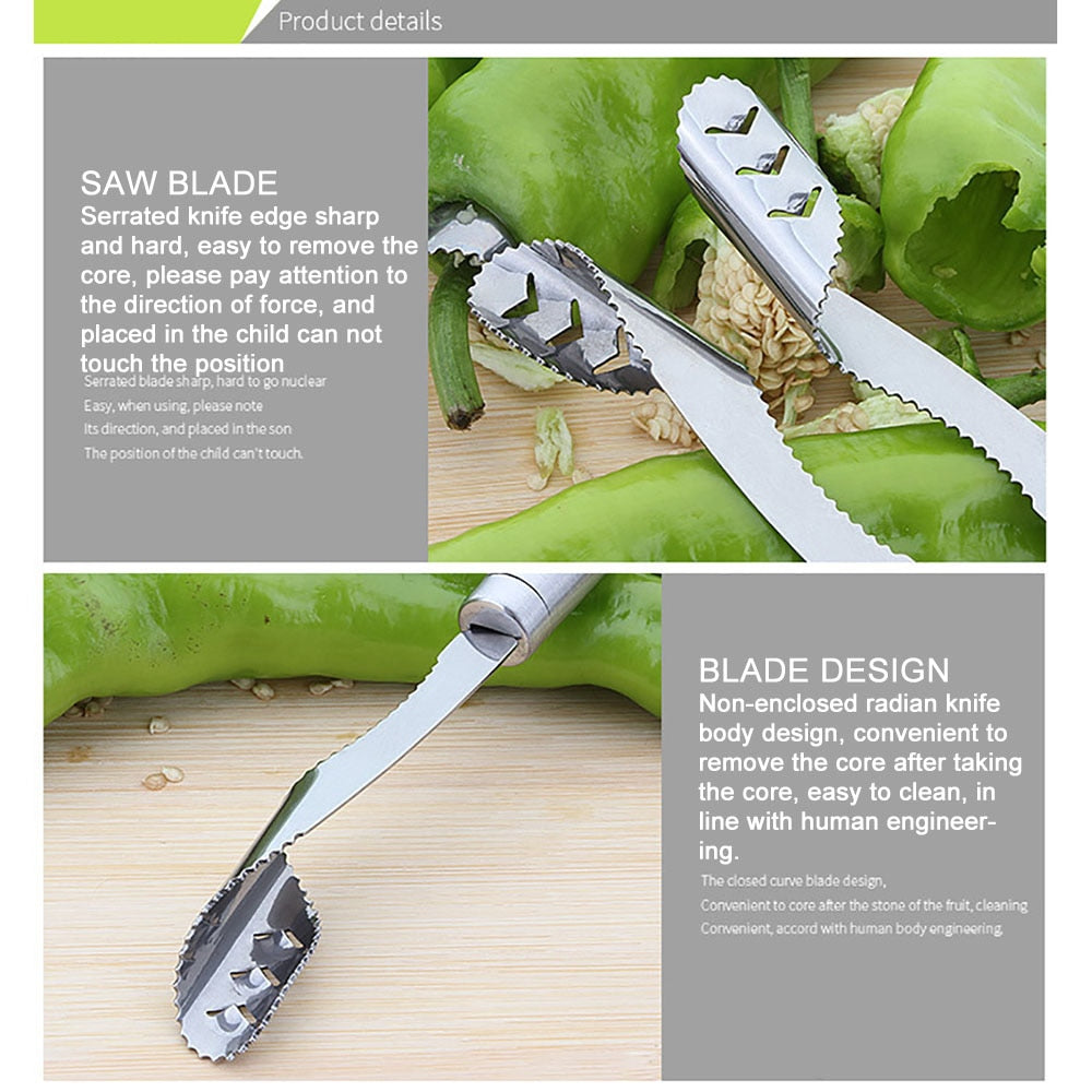 SHARP EDGES FOR SLICING: Safe and comfortable and can control operations such as coring of pepper, chrome-plated hook end, easy to hang, non-slip handle, faster and more accurate than coring device or an ordinary knife.