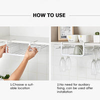 Hanging way for storage. This product is a wine glass, mug, and plate holder that anyone can install onto their countertop. You can hang it under the cabinet. You can put the plate, glass, mug, etc.