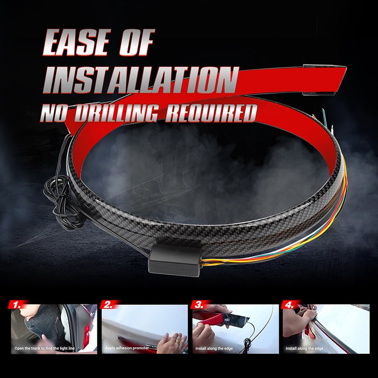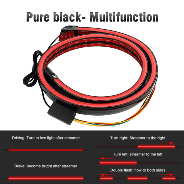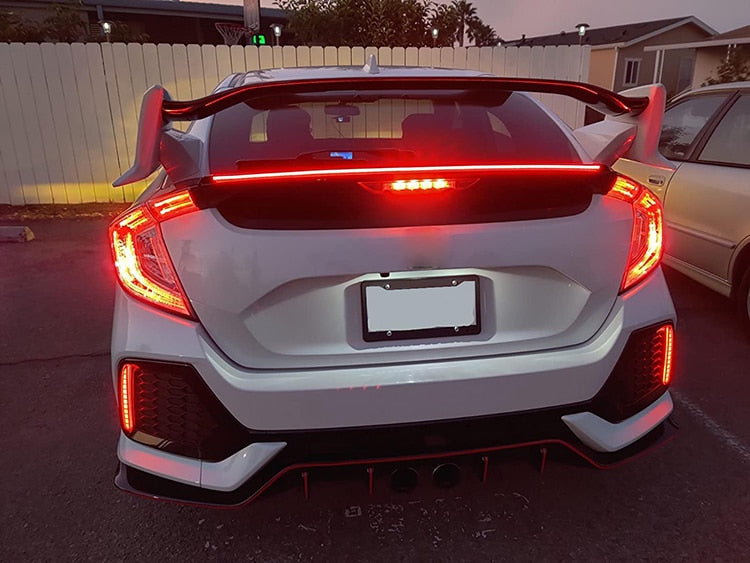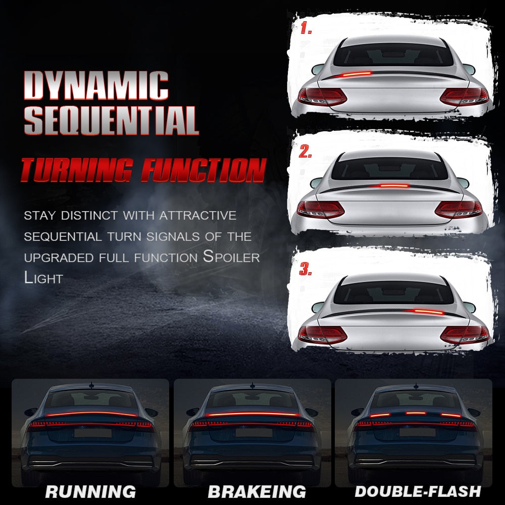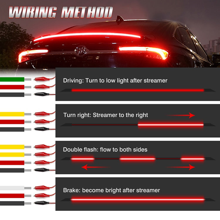 5 LIGHTING MODES: When you turn on the daytime running lights, the spoiler light strip remains lit at all times. The brake light strip becomes brighter when the brakes are activated to alert the rear to safe driving. The light comes on from the center and moves quickly outward when you press the hazard warning button. The streamer of the universal spoiler light will turn left or right when you turn on the turn signal light.