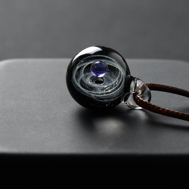 This is a beautiful necklace that will make you feel like you are in outer space. The necklace has the solar system with all of its planets and stars, including our sun. It comes on a black cord, so it can be worn as an accessory to any outfit.