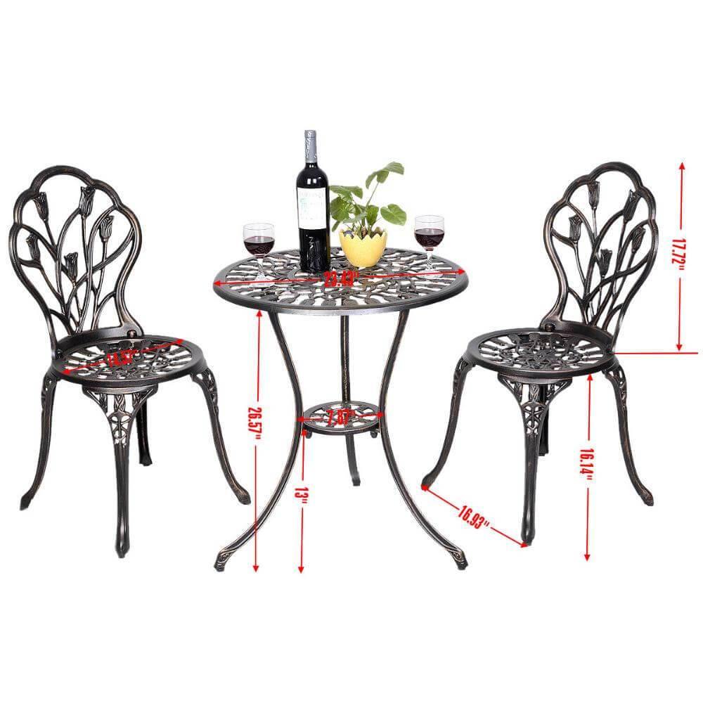 Our beautiful brand new 3 pieces Bistro Set which is a perfect addition for your outdoor living spaces and eating areas. Made of durable cast aluminum, this set of Patio Furniture offers you the most beautiful look when enjoy yourself. And it is easy to assemble and will assure you years of use.