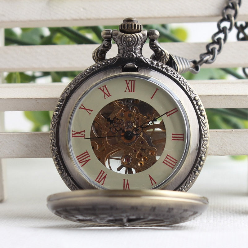 Classic and elegant silver-tone Roman numeral design exhibition covered pocket watch. Intricately designed front cover opens to expose beautiful silver Roman numeral dial with exhibition center to display movement and its moving parts. Perfect addition to a formal or casual dressing or collection.
