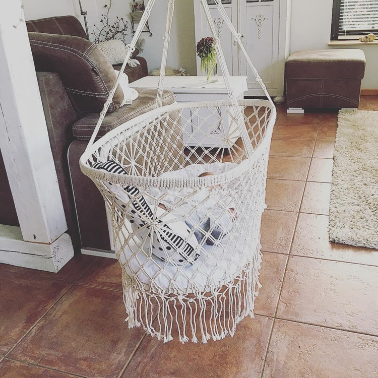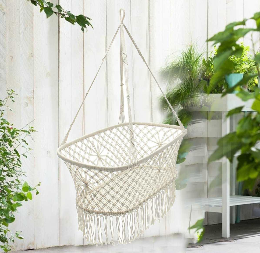 An adorable hanging cradle soothes infants with a safe and comfortable place to sleep. Perfect addition to a baby nursery or bedroom. Lulls baby to sleep with gentle rocking movement like a hanging baby hammock. Parents can rock the cradle or let the baby's movements gently move the baby's swing crib. Gives new parents relaxation and peace of mind.