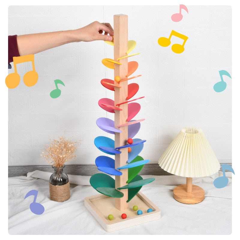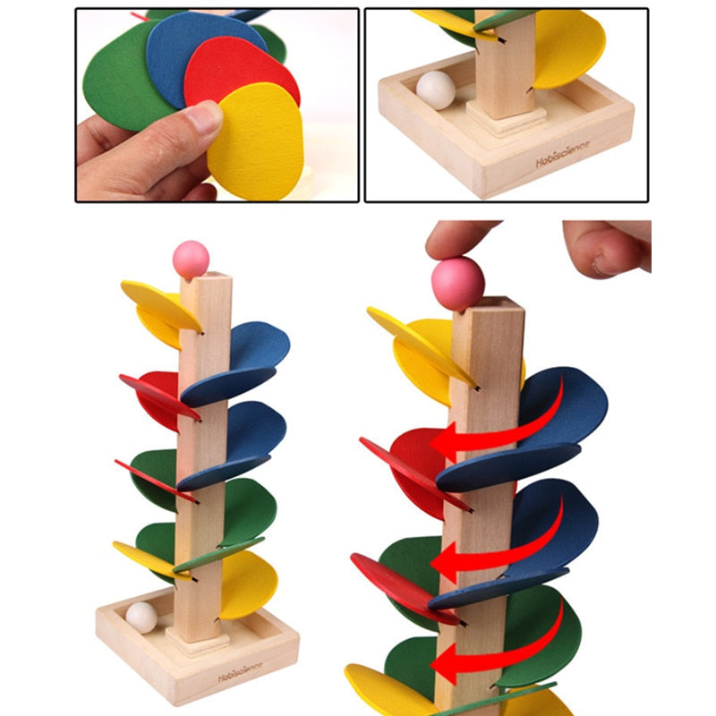 • How to play: put the little on the top of the columns, and the ball will roll down to the chassis from the color chips.